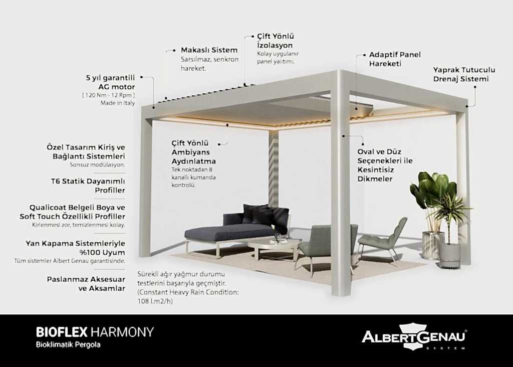 Albert Genau Biokimatik Pergola Sistemi, tek motor ve uzaktan kumanda ile hareket eder. Pergola sisteminin lamellerin senkronize hareketi, özel tasarım makas sistemi ile sağlanır. Kendi kendine ayakta durabilen Albert Genau Bioklimatik Pergola Sistemi, her tülü iklim koşullarında sorunsuz ve konforlu kullanım için tasarlanmıştır.